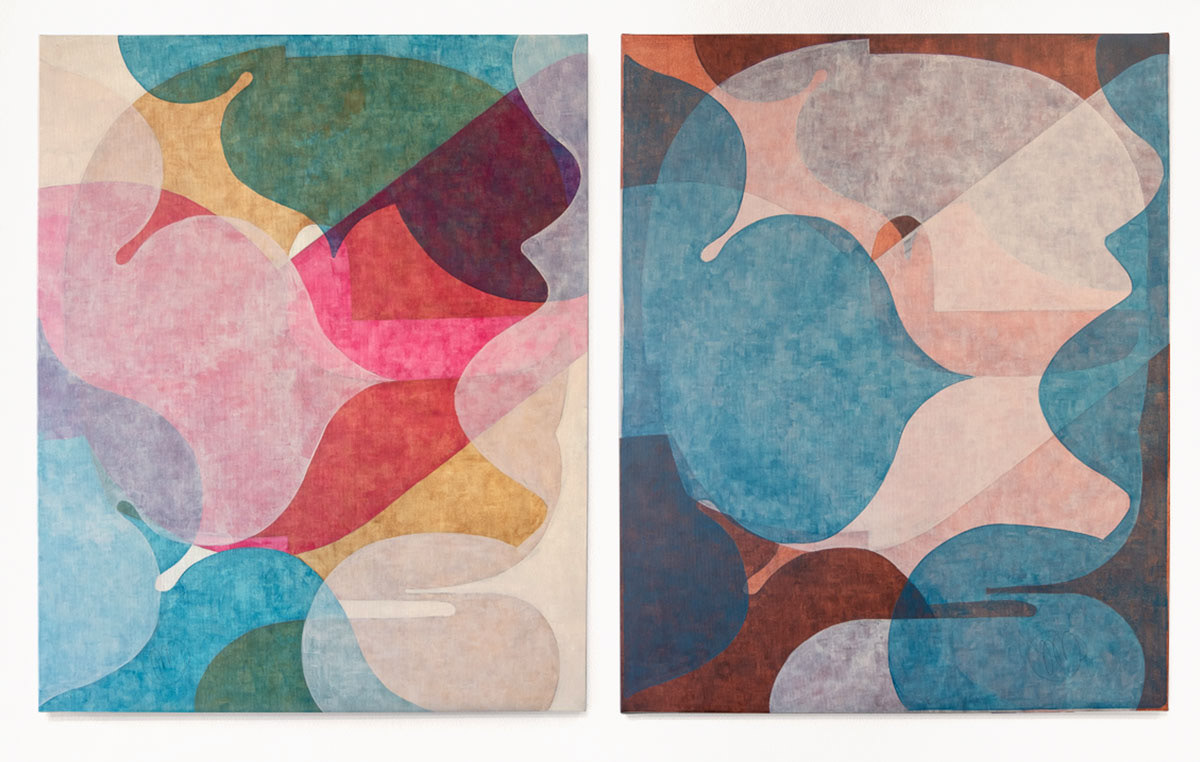 The project works with a limited set of geometric forms treated as elements of a coherent visual structure. Paintings are created in small groups (usually two or three works) which can function independently, yet together form a closed set. Installed side by side, they may operate as diptychs or triptychs, sometimes merging into a single expanded composition.