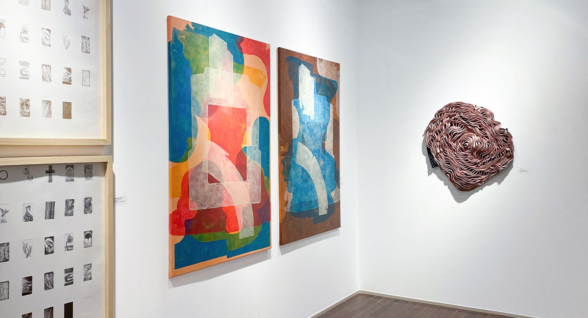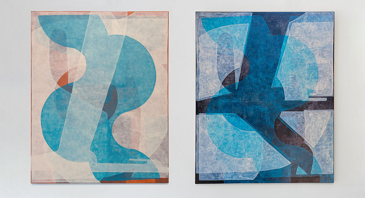 In the first, a restricted vocabulary of shapes is used to produce different compositions within one coherent set. The same or closely related forms reappear across paintings, yet their scale, position, and relational dynamics shift. The result is a group of distinct works that remain structurally connected.