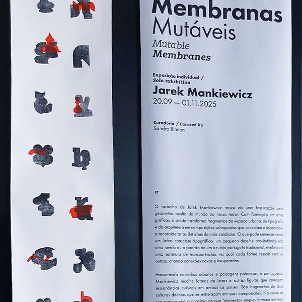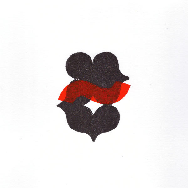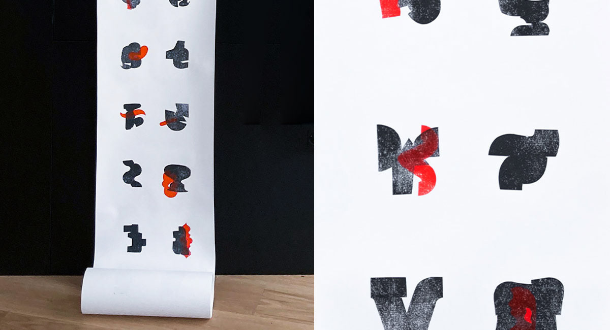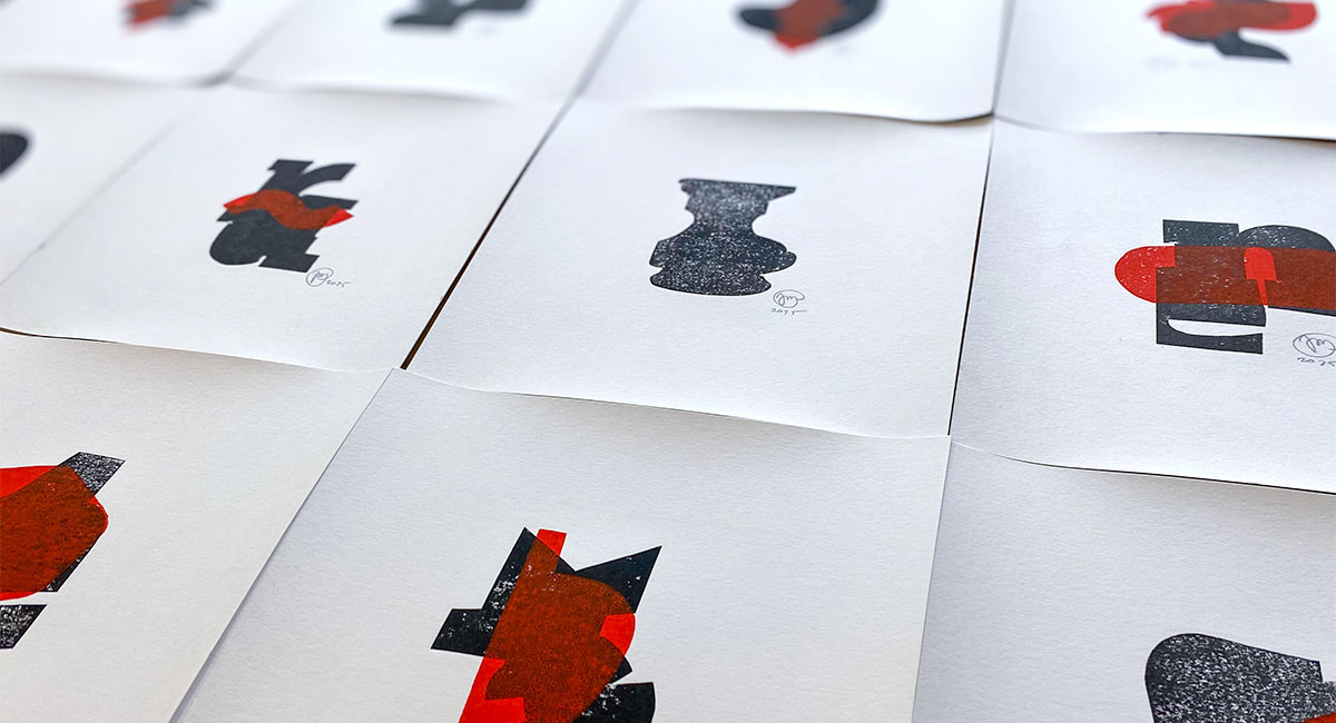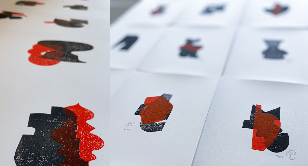 Part of the series was created from a single matrix printed in black ink. Other works combine two matrices, with a second layer printed in red. The superimposition introduces tension between structure and variation, echoing the layered logic present in the paintings.