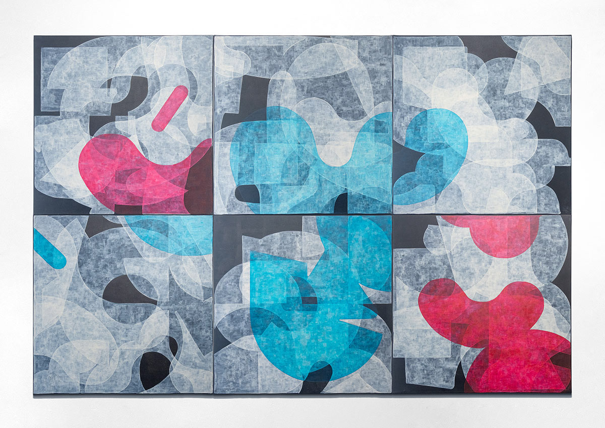 The second stage of the project translated this modular logic into larger formats. Square canvases (80 × 80 cm) were created as independent units, possible to assemble into larger compositions. Scale changed, but the structural principle remained intact.
